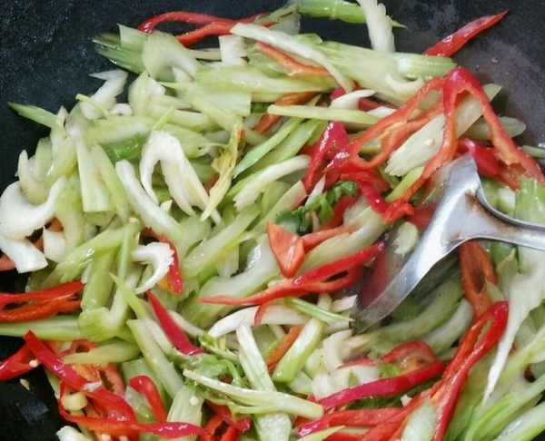 3、入西芹快速炒勻加鹽、味精。完成