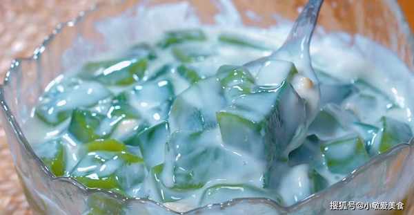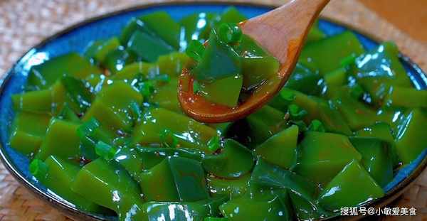 8、時間到,QQ彈彈的艾草豆腐就做好瞭。切成塊放入盤中,再倒入辣椒油,撒上蔥花或者是蒜末,攪拌均勻以後就可以開吃瞭,也可以放上蜂蜜或者牛奶。