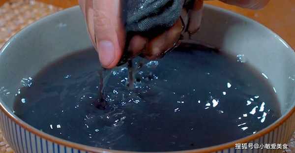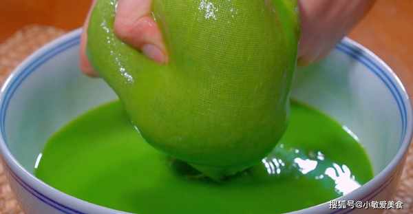4、大盆的上面鋪上一層紗佈,把艾草汁全過濾一下。