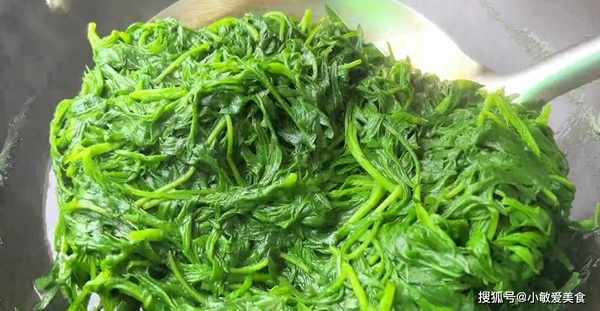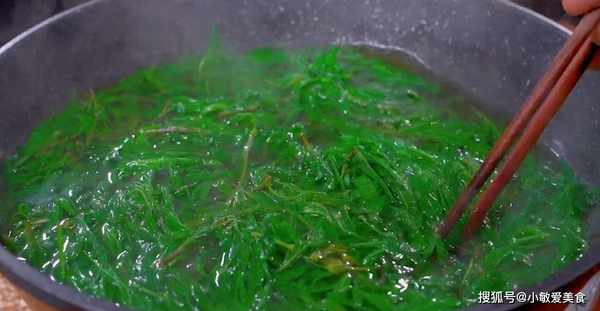 2、鍋中加入清水,燒開後把艾草倒進鍋中,加入一勺食鹽,適量的食用小蘇打,再倒入適量的食用油,把艾草焯一下水,水開以後煮兩分鐘就行瞭,撈出來過一下冷水,把水分擠幹。