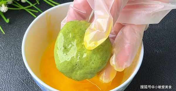 5、碗中打入一個雞蛋,倒入少許鹽,增加底味,用筷子打散,再把艾草團放入雞蛋裡,裹上一層雞蛋液。