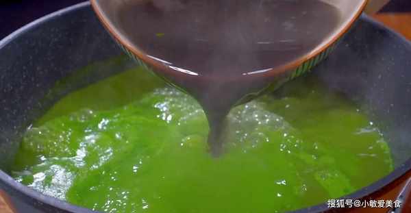 2、起鍋燒水,倒入三克小蘇打,使艾葉保持翠綠的顏色。放入艾葉焯一下水,用鏟子翻拌一下,使其受熱均勻。再次水開,煮個兩分鐘,撈起瀝幹水。