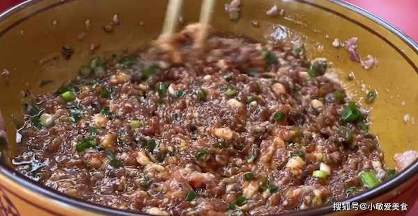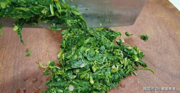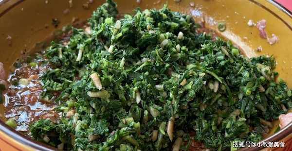 4、把苦菜剁一下,剁好後放在肉餡中,肉餡拌勻之後,再根據個人口味加入適量的鹽,再次拌勻之後,這個餡就調好瞭,特別的香。