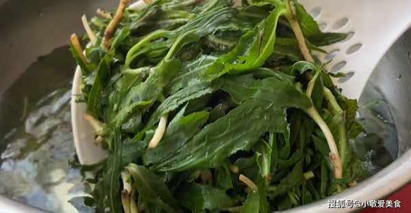1、挖回來的苦菜,多清洗幾遍,控水備用。鍋內加水燒開,放入清洗幹凈的苦菜焯一下水。翻動一下,使它受熱均勻。焯水一分鐘後撈出,放入涼水內過涼,過涼後的苦菜擠進水分。