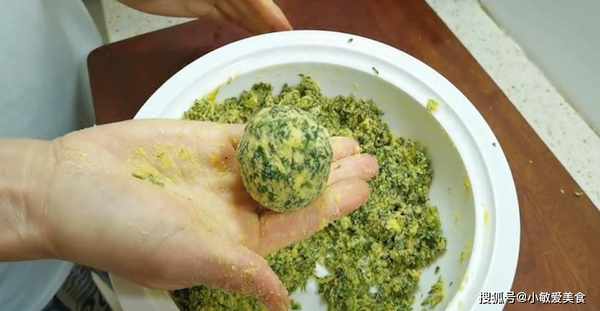 3、攪拌均勻以後,取一把菜餡使勁攥。攥緊實後團圓。