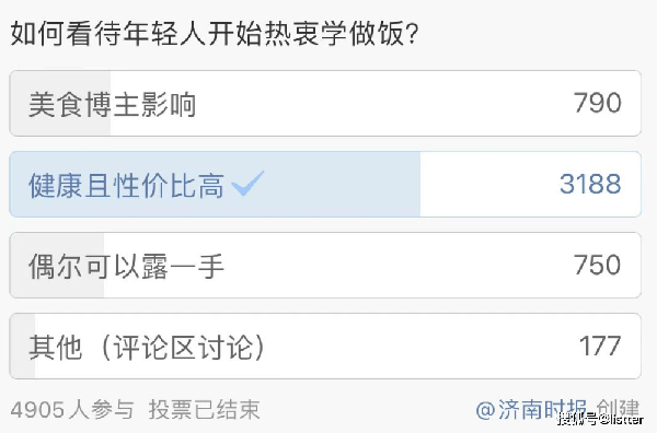 不過在熱搜裡,調查結果其實已經給出瞭直接答案——最主要的還是自己做飯健康且有性價比。一位江蘇網友表示,“我就是覺得自己做飯健康、衛生,而且還能省錢。”另一外四川網友觀點也別無二致,表示自己做飯健康又好吃,最主要的是便宜。