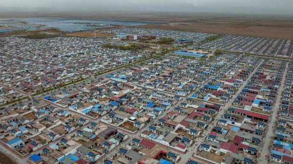 這是一個生態移民村,2013年從固原隆德整村搬遷而來,也是村名的來由。全村統一規劃建造,一排排整齊的平房小院從空中看上去就像是集成電路,地址也很數字化:x組x排x號,配上葡萄圖案,村落屬性一目瞭然。