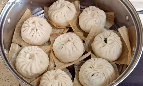 5.取一張包子皮,用勺子舀入適量菜餡,將包子皮拎起,轉圈捏褶收口,將菜餡包起來,蒸鍋內加入適量的清水,在包子下面墊一張玉米葉,將包子擺入籠屜,註意保持空隙,然後蓋上鍋蓋,醒發15分鐘後,開大火蒸,上蒸汽後,再蒸15分鐘,關火後燜2分鐘,然後取出,即可食用。