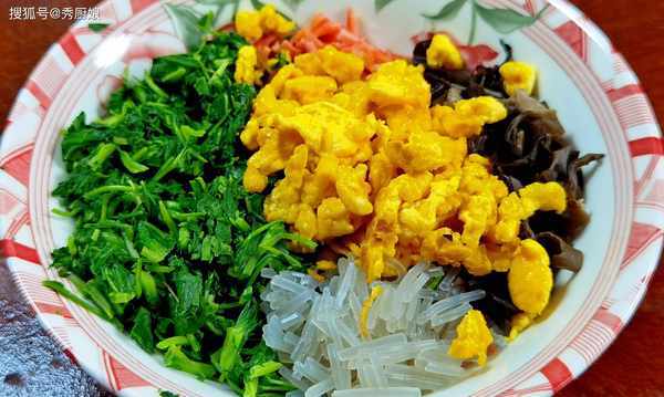 準備食材:苜蓿菜、面粉、雞蛋、紅薯粉條、胡蘿卜、黑木耳、鹽、生抽、香油、酵母粉、食用油。