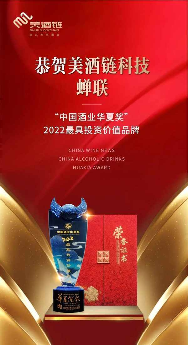 2023年“中國酒業華夏獎”頒獎典禮於4月10日下午在成都祥宇賓館舉行,美酒鏈科技因具有突出的科技創新表現、賦予高端白酒收藏和價值賦能的行業影響力,再次蟬聯“中國酒業華夏獎:2022最具投資價值品牌”獎項,這是中國酒業權威機構和消費大眾對美酒鏈科技創新精神的高度認可。
