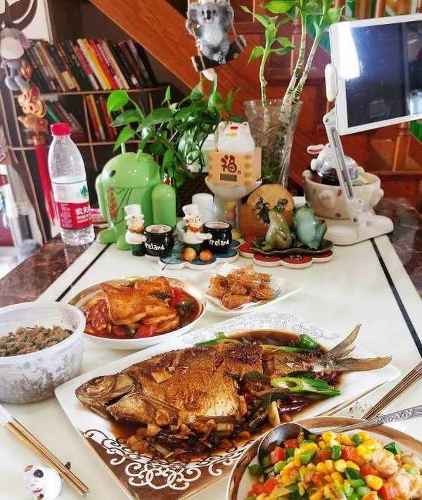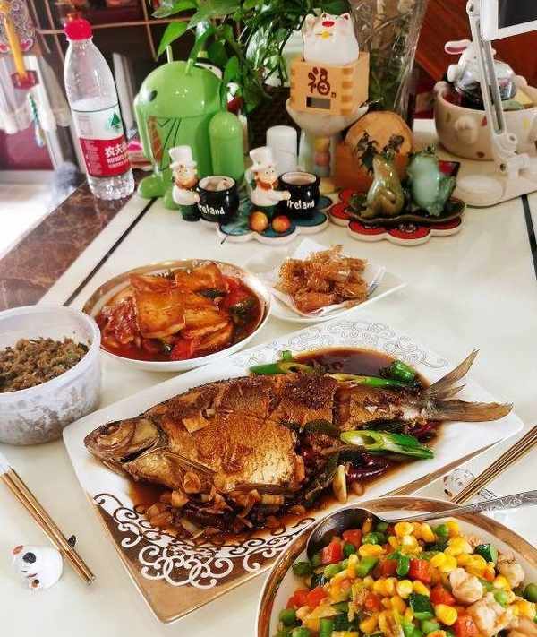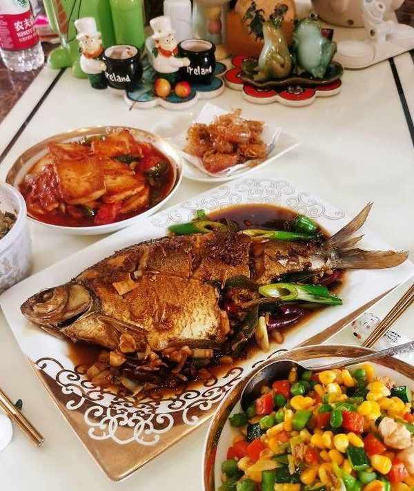 午餐:硬菜是紅燒鯧魚。——1.蔥切絲,薑蒜拍碎,鯧魚洗剝幹凈,尤其要去除腹腔裡的黑膜(去腥)。2.在魚背上各劃幾刀,幫助入味,放入盤中。3.加少量鹽,白胡椒粉和料酒薑絲,塗抹均勻醃制。4.調一個料汁碗~料酒一勺,海鮮醬油兩勺,香醋一勺,白糖一勺鹽少量,花椒幾顆,幹辣椒段少許,加五勺水,攪勻備用。5.炒鍋熱鍋涼油,油溫六七成熱,下入鯧魚煎制,不要翻動,等一面定型上色後,輕晃鍋子可滑動,就可以翻面煎制,兩面金黃上色後,下入薑蒜末爆香。6.倒入調好的那碗料汁燉煮,燉至湯汁減少一半的樣子,用鍋鏟給魚翻面,繼續燉煮。7.可以用一根筷子插一下魚脊部厚實的部分,能輕松插透,魚就燉熟瞭。8.下入蔥絲,片刻後,即可關火。出鍋裝盤上桌開吃啦!