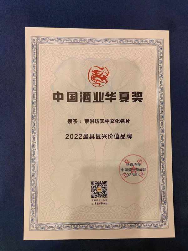 4月10日,2023年“中國酒業華夏獎”頒獎典禮在成都祥宇賓館隆重舉行。頒獎典禮上,蔡洪坊戰略單品天中文化名片被評為“2022中國酒業華夏獎最具復興價值品牌”,以高端豫酒別樣的品牌魅力和文化內涵,完美詮釋瞭中國酒業的傳承與創新。王永華總經理榮膺“2022中國酒業華夏獎新銳人物”,這是業界對其經營管理實踐和社會經濟績效的認可,更是對蔡洪坊人不畏艱難、勇於開拓市場、不懈進取精神的褒獎。