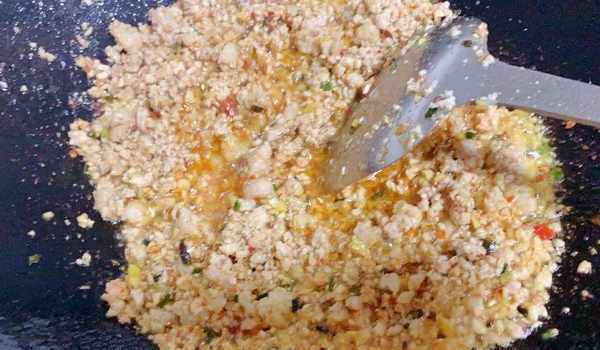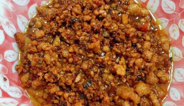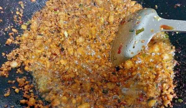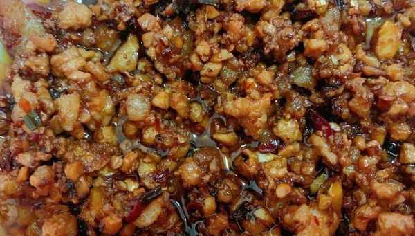 鍋裡放油,加一勺肥油,炸後會更香好吃,油熱後,將薑末、蒜末和蔥花放入鍋中炒香,放入肉末,並攪拌以去除脂肪中的脂肪。不同的醬汁會更香更好吃。肉末炒好後加入豆瓣醬攪拌均勻。