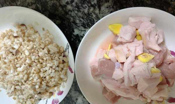 豬肉做好後,將肥肉和瘦肉修剪到最後。由於我用的是絞肉機,所以我先把它切成小塊。自己切的話,可以先切成片,再切成片,最後切成片。丁然後切碎,自己切的話味道會更好。絞肉機出來的肉有的肉末大,有的肉末細,影響口感。肉切好後,將香菇放入雞肉中,一起切。薑蒜剁碎,蔥花蔥花剁碎,開始烤肉。