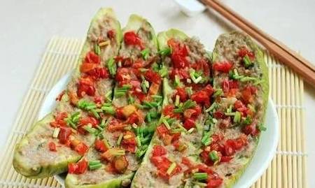 3.將煎好的茄條碼在盤子上,鋪上剁椒、蒜蓉、調好的肉末。