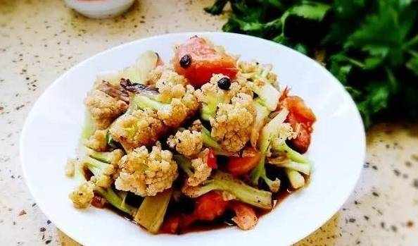3、倒入洗好的花菜,開大火翻炒