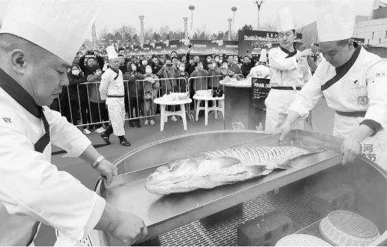 在4月6日的開幕式上,由著名遼菜大師劉劍團隊主理的千魚盛宴成為整個活動的最大亮點。50位名廚上陣,2000斤湯河魚,上百種烹飪做法,1500盤鮮魚佳肴陸續擺放在現場兩側的50米長條桌上,讓遊客大開眼界。
