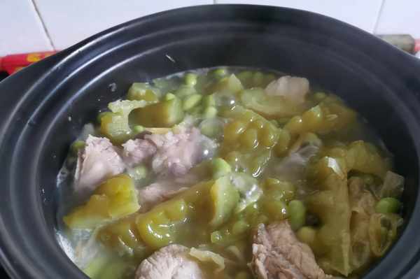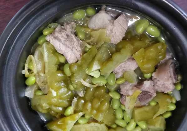 這道靚湯烹調起來非常簡單,食材除瞭苦瓜、鮮黃豆和排骨,還需要些許咸菜、蔥白、薑絲等輔料。先把苦瓜、鮮黃豆、排骨和咸菜、青?分別洗凈,苦瓜去核切塊,鮮黃豆浸泡片刻,排骨切成段狀,咸菜切段,青?切段,生薑切絲,然後一起放進砂鍋裡,加入適量的清水,用中火煮20分鐘左右,火候恰到好處時,加入雞精調味即可起鍋食用。