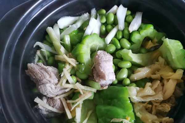 鮮黃豆含有豐富的植物蛋白以及異黃酮、低聚糖、皂苷、磷脂、核酸、胡蘿卜素以及維生素等。中醫認為,黃豆性平,味甘,具有寬中行氣的功效。在苦瓜湯中加入鮮黃豆,能夠使湯水變得濃鬱,苦澀的味道變得香甜,還能夠增加苦瓜湯的營養,食用之後能夠增強免疫力、降低血脂。