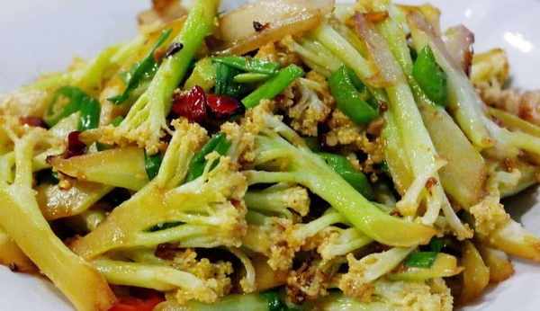 菜花洗凈後,就可以烤瞭。首先鍋裡放油,把薑蒜爆香,然後把花菜放進鍋裡炒均勻,然後加入適量的水,不要太多。水燒開後,花椰菜也是油炸的,不僅吃起來脆脆的,而且非常好拌,比焯水的花菜好吃。