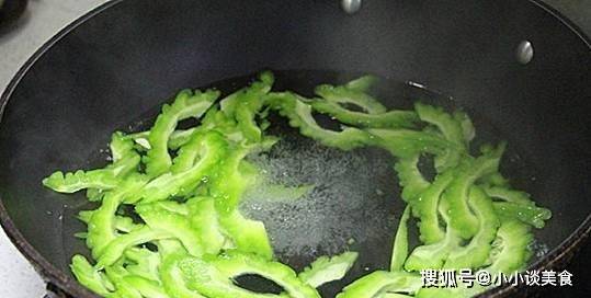 1、苦瓜洗凈,去核,切片。鍋中燒開水,加入油和鹽,放入苦瓜片,用開水焯30秒,撈出。