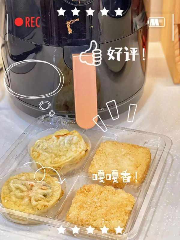 無需解凍,放入空氣炸鍋中炸一會兒就能吃!每一袋中有兩個粢飯糕和兩個油墩子, 不愧是老字號,處處都透露著用心!!!
