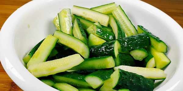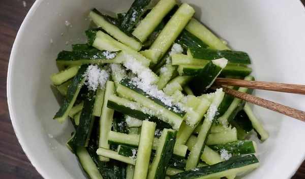 切好後放入大碗中,加入適量的食鹽醃制10-15分鐘左右,讓黃瓜出水。這樣醃制出來的黃瓜口感脆爽好吃。