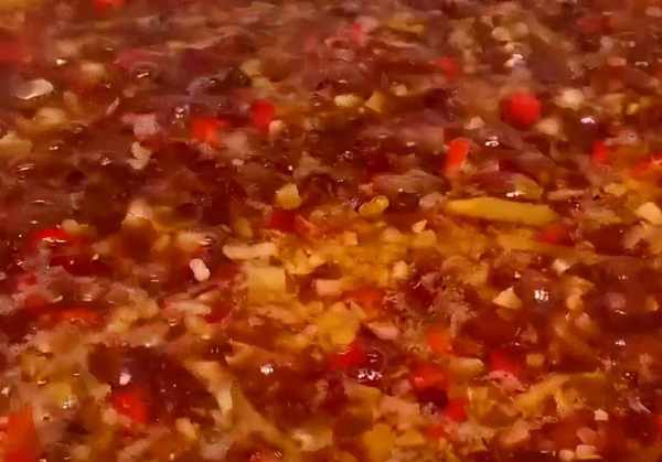 熱鍋燒油,油熱後加入一把花椒子,把小米椒,薑絲,蒜末也放入,炒出香味
