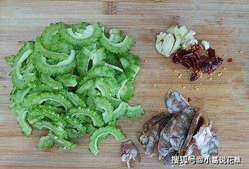 1.苦瓜1條洗凈,去籽,切薄片。將半個小香腸切成薄片。2瓣壓碎的大蒜。3條幹辣椒1小塊。