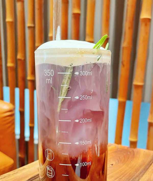 氣泡美式+奶泡,裡面加瞭蝶豆花,有個漂亮的漸變分層,味道相對來說比較淡。