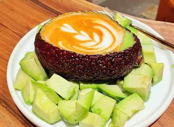 把牛油果挖出來做容器,味道就是單純且純正的拿鐵,沒有牛油果的味道,果肉單獨放在旁邊。