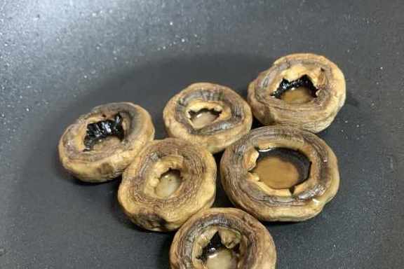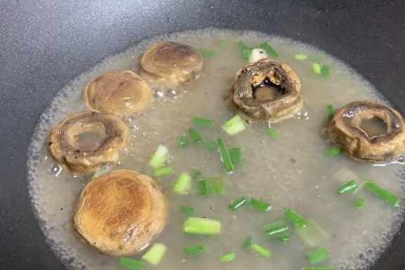 第四步:翻轉另一面,繼續煎至口蘑出很多水分。