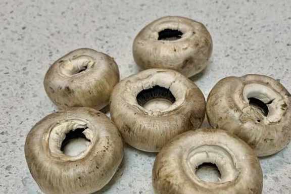 第一步:準備所有的食材,口蘑放進盤中,加入適量的清水,再加入1勺鹽,用筷子攪拌均勻後浸泡片刻,再用清水沖洗後撈起瀝幹水分,去掉口蘑中間的小丁備用。