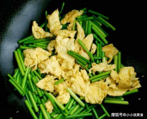4、最後將青蒜倒入鍋中快速炒熟。食材炒到爛瞭之後,加入雞蛋,撒上香料,炒到食材入味,就可以裝盤瞭。