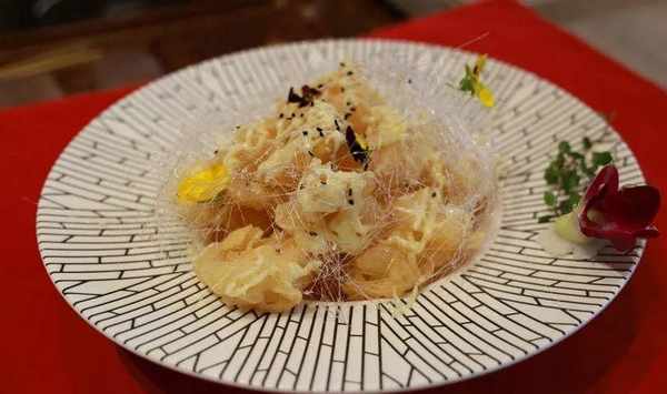第五步:把炸好的蝦球裝入用沙拉水果打底的盤中,裱上沙拉。