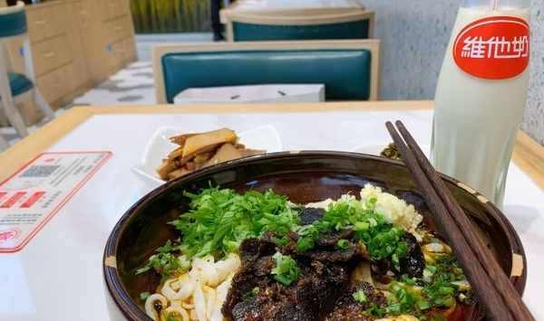 而且店面裝修很乾淨,門口是藍底白字的牌匾,有點古典風味,寫著600年匠心製作,店內更是現代網紅風,桌子凳子看上去都很別致,廚房也是明廚亮灶,一看就讓人心情愉悅。還經常有優惠,一份米粉加一瓶維他命奶比單點要便宜幾塊錢,而且可以免費加各種配菜,可以說性價比很高。