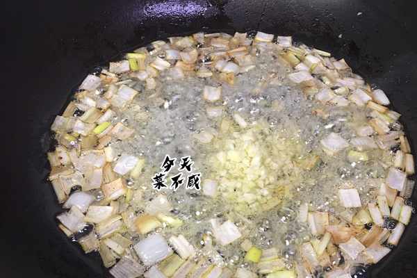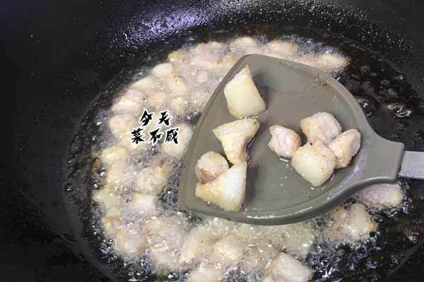 4,炒鍋上火燒熱多放一點色拉油做底油,放入五花肉丁炒至變色斷生後,放入薑末、蔥花小火炸三分鐘左右至金黃色,炸出蔥薑的香味後,再放入蒜末小火炒香。
