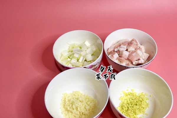 1、把五花肉洗凈去掉豬皮,切成1.5厘米左右見方的方丁,大小可參照自己的大拇指。大蔥洗凈,一切兩半然後頂刀切成指甲蓋大小的蔥花。薑去皮洗凈切成薑末,蒜子拍碎後剁成蒜末。