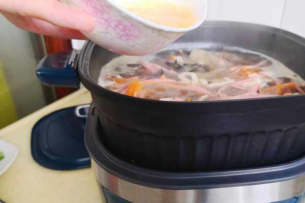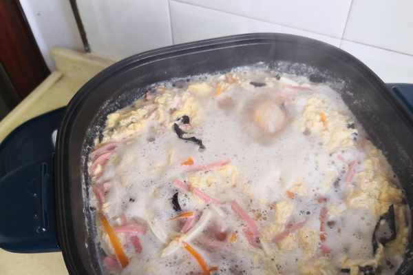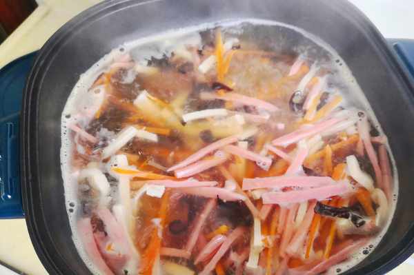 6.鍋裡燒水,燒開後加入胡蘿卜絲、豆腐絲、木耳絲和火腿絲,煮開後加入調好的料汁,