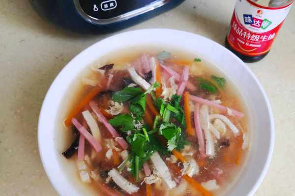 好喝不過酸辣湯食材:胡蘿卜半根,木耳1把,火腿腸1根,豆腐1塊,雞蛋1個,香菜少許,鹽1小勺,生抽1勺,胡椒粉1勺,醋適量,淀粉適量,