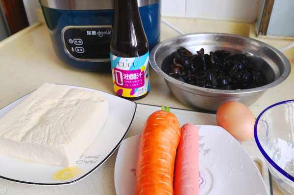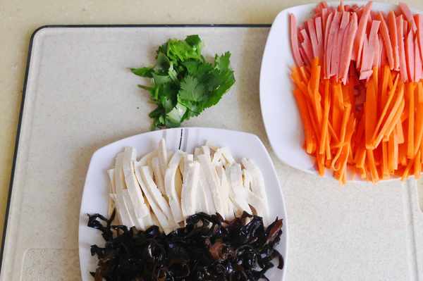 2.將胡蘿卜、火腿腸、豆腐和木耳切絲,香菜切碎,