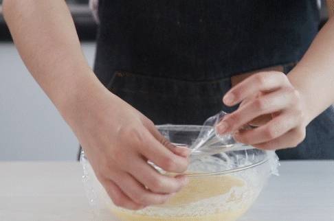 5、撕掉保鮮膜後攪拌一下,把氣泡攪散,重新恢復成細膩面糊。
