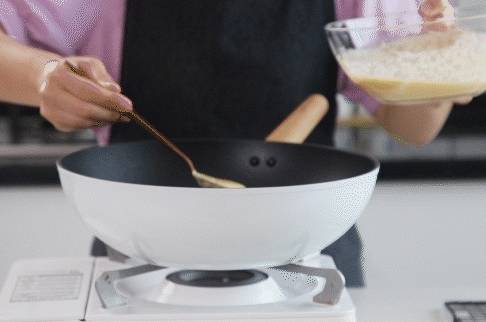 6、不粘鍋小火加熱,舀一勺面糊,從高處往中心點倒入。小火煎至表面佈滿氣孔,餅皮就做好瞭。