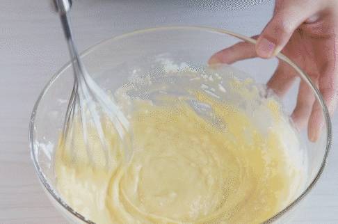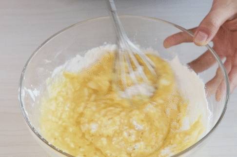 3、倒入面粉、小蘇打、鹽,打入雞蛋,攪拌成細膩面糊。