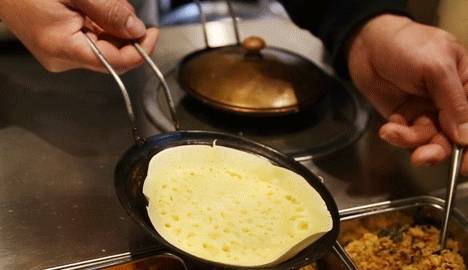 把發酵好的面糊,倒入不粘鍋,等冒出小氣泡,松軟美味的蛋餅皮就完成瞭。再放入餡料對折,一個蛋烘糕新鮮出鍋,隨吃隨做,口感特別好。