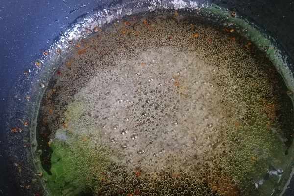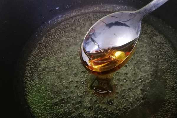 第六步:等到糖熬得冒大氣泡時,顏色微黃,加入一勺麥芽糖,加入麥芽糖的目的是,可以使糖漿變得濃稠而且還不會發硬。