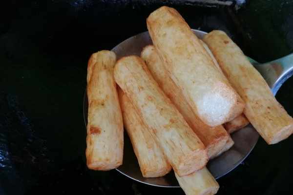 第四步:鍋裏倒入油,油熱之後,把山藥放進去,小火炸至表面金黃撈出,因為已經煮熟了,所以只需把表皮炸的金黃就可以了。