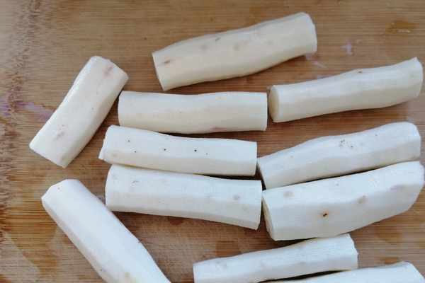 第二步:把山藥去皮,切成段,這一步要注意,因為山藥裏會有一種黏液,會引起皮膚過敏,敏感肌膚的朋友記得戴上手套來操作。