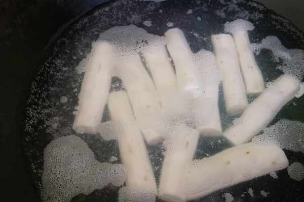 第三步:切好的山藥過水焯一下,多煮一會,把它煮熟,因為炸的時候不容易炸熟。