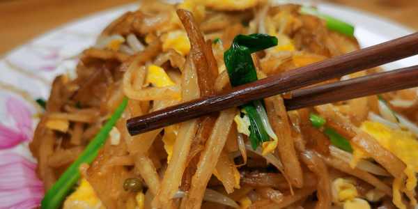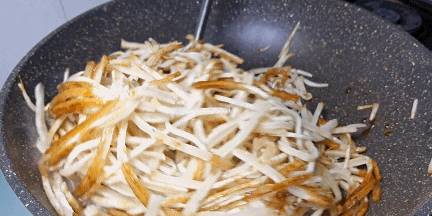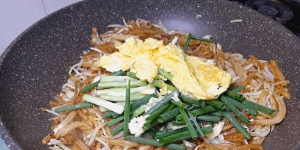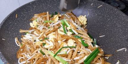 7.接著下入餅絲,再次翻炒1分鐘,讓餅絲吸收鍋內的湯汁。